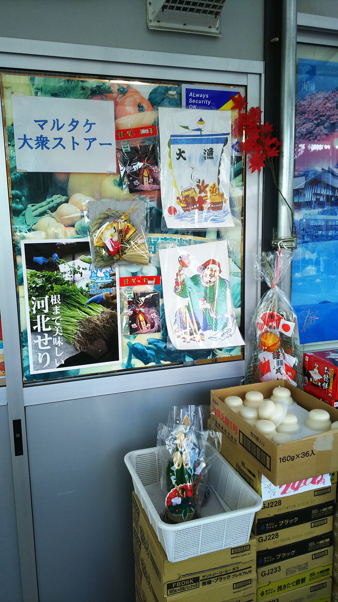 歌津のお正月飾りが並ぶマルタケ大衆ストアさん、大漁船やカラーの恵比寿様、大黒様を発見!