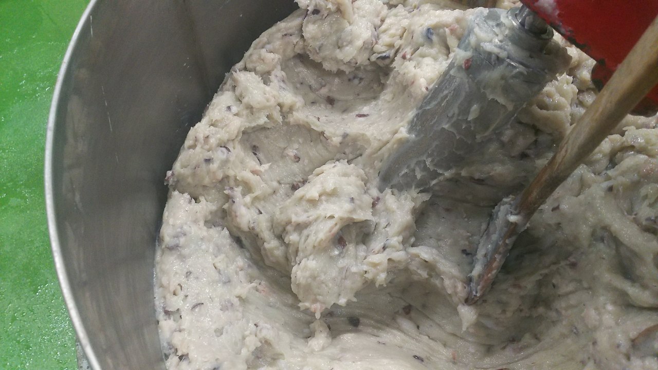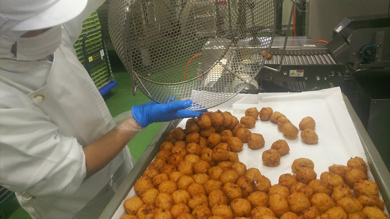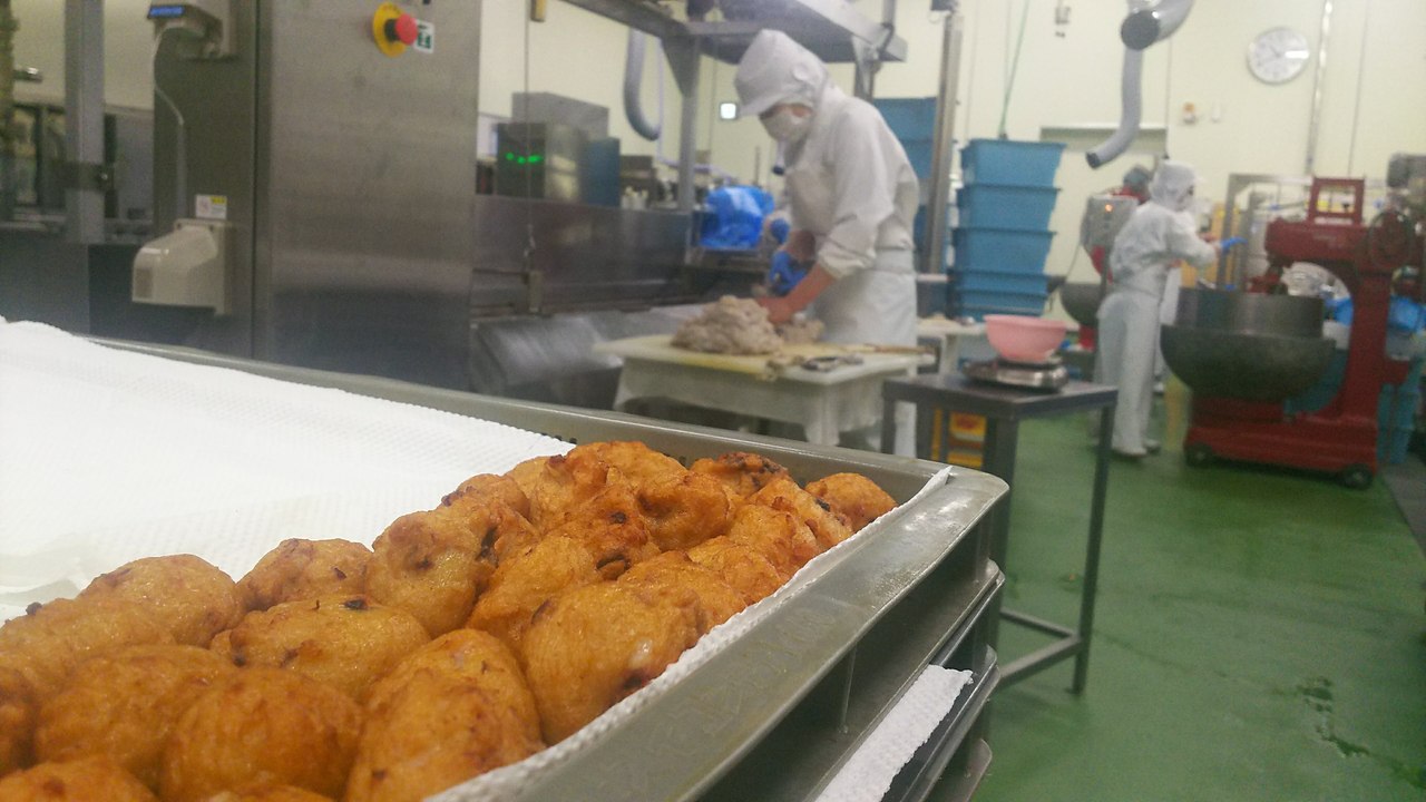 寸分違わぬ重さで、及善蒲鉾さんオリジナルの「タコ揚げボール」が次々と油に投入されて行く!