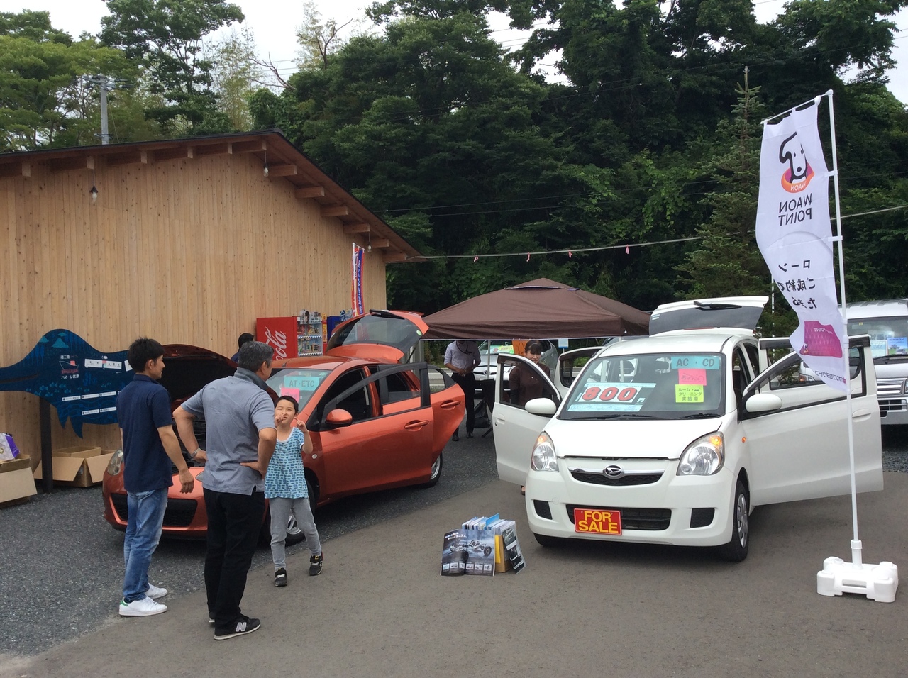 「フリーマーケット」の出店数も今までで最も多い10店舗を数え、その中でも超目玉となったのが地元歌津町で頑張っている「ハーレー自動車鈑金」さんが出品した800円のダイハツ ミラと8万円のマツダ デミオ!(@_@)